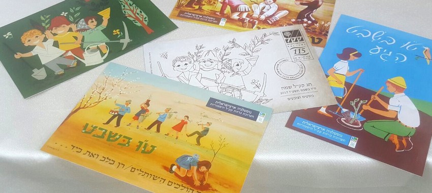 שי מאת הקרן הקימת. באיור נראים ילדים נוטעים עצים, על רקע נוף התיישבותי ולצדם הקופסה הכחולה. עיצוב: מ. גפן