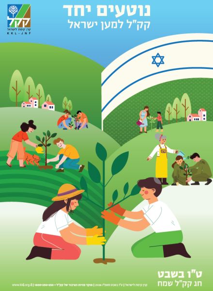 גם הילדים עולים וצומחים בעת שתילת העץ. ציפורים מצייצות מלמעלה. עיצוב: פ. מושל, ארכיון הצילומים של קק"ל