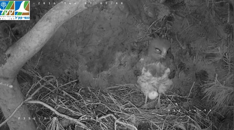 תשעה ימים אחרי ההטלה, ב-4.4.2016, בשעה 21:45, נעמדה קרן בקן כשהביצה דבוקה לנוצות הבטן שלה. קרן המשיכה לדגור כרגיל עד הבוקר, אבל בזמן החלפת המשמרות הרגילה, עזבה קרן את הקן כשהביצה צמודה אליה. כך נחרץ גורל ההטלה הזו, שהפכה מהטלה להפלה...