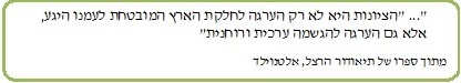 מסבירים: בציטוט זה, כמו בקטע מתוך ספרו של תיאודור הרצל, בפני עם ועולם, שפגשנו במפגש הרביעי העוסק בהקמתה של קק"ל, מגדיר הרצל את הציונות כרעיון מתמשך, החותר ליותר מאשר עצם הקמת המדינה, ולמעשה שואף לשלמות מוסרית ורוחנית.ציונות, לרובנו, מתפרשת כשאיפה להקמת מדינה יהודית בארץ ישראל ומאבק יומיומי לשמירה עליה. למעשה רובנו מקשרים את המונח ציונות לאדמה, כיבוש האדמה והשמירה עליה, אך האמת היא שציונות, גם בעיני בנימין זאב הרצל, עולה בהרבה מעבר לגבולות האדמה. היא חלום לחברה ערכית, מוסרית, שיוויונית וצודקת בישראל.