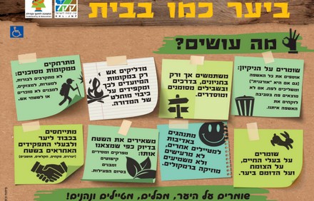 כרזה המפרטת את כללי ההתנהגות ביער באופן תמציתי ופשוט. הכללים מחולקים ל"עשה" ו"אל תעשה". הכרזה מיועדת לתלייה בתחומי המחנה, כתזכורת לכך שגם היער הוא בית זמני עבורנו, בית אהוב וחשוב, שיש לשמור עליו ועל בעלי החיים והצמחים שבו.