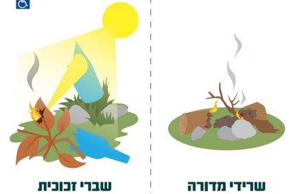 לפניכם שתי תמונות. בתמונה הראשונה ישנם לפחות ארבעה גורמים העלולים לגרום לפריצת שריפה ביער, ובתמונה השנייה ישנם לפחות ארבעה גורמים שעוזרים לעצור את השריפה. מצאו אותם