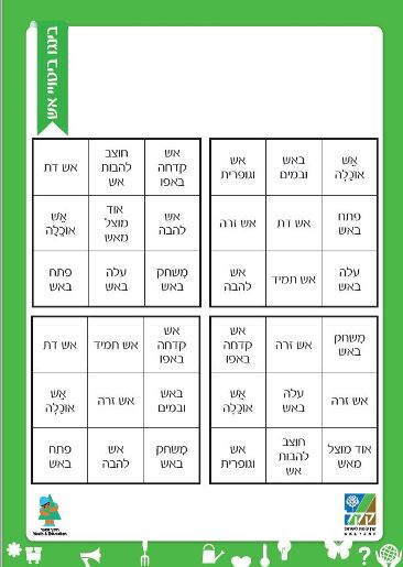 הכינו מראש לוחות משחק (שלוש עמודות ושלוש שורות). בכל לוח יופיעו תשעה ביטויים. קראו בקול את הפירושים.כל משתתף שעל הלוח שלו מופיע הביטוי התואם לפירוש – יקיף אותו בעיגול. הראשונים שמסמנים שלוש משבצות ברצף (עמודה, שורה או אלכסון) – הם המנצחים במשחק.לוח ביטויים הקשורים באש