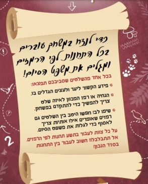 שימו לב! חפשו היטב בין השלטים גם רמזים שאומרים אילו אותיות צריך לאסוף כדי לגלות את משפט הסיום.
