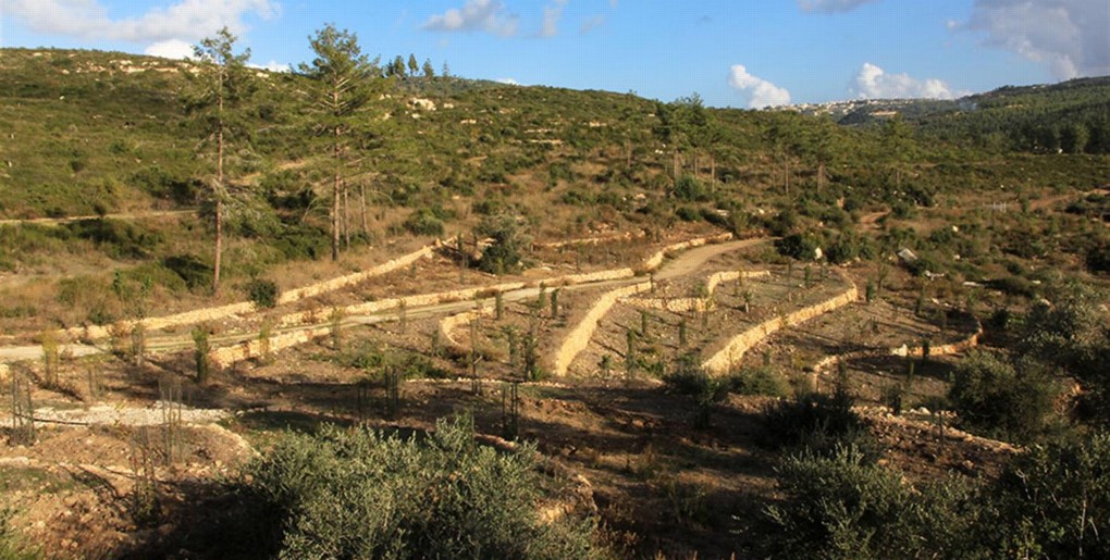 השביל מתעקל שמאלה ומגיע לשלט שהציבה קק"ל. השלט צופה על מערכת יפהפייה של טרסות מחודשות, נטועות בוסתנים. מיכאל ויינברגר, מנהל אזור כרמל וגליל מערבי בקק"ל, מספק לנו הסבר: "השריפה חשפה באזור הזה טרסות חקלאיות שלא ידענו על קיומן. בשנות ה-50 וה-60 של המאה ה-20, כאשר ניטעו כאן היערות, לא ייחסו לטרסות האלה תשומת לב מיוחדת. עכשיו נפלה בידינו הזדמנות לתקן את המעוות ולהשיב לכרמל את נוף התרבות הקדום שאפיין אותו.