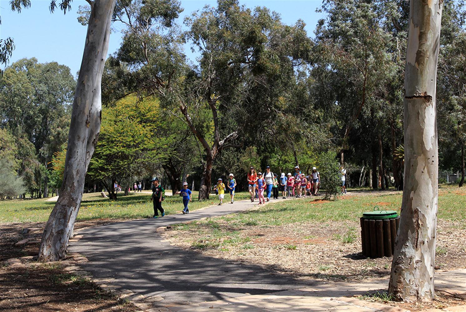 הטיול מתחיל בחניון הסמוך לכניסה. מכאן נצעד אל השביל המרכזי בגן, החוצה מדשאה רחבת ידיים. לפני שנגיע לשביל נתבונן בצמח בעל מראה של דקל קטן, הצומח לבדו לפני מרכז המבקרים. זהו