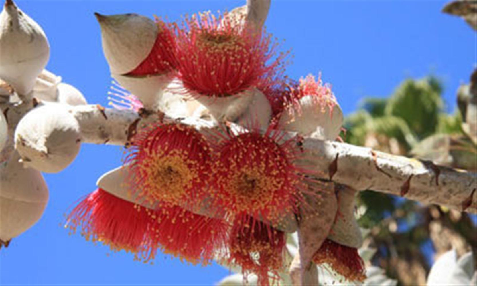 אקליפטוס גדול-פרי (9) (Eucalyptus macrocarpa). העץ, המזכיר במראהו שיח, צומח בר באזורים הצחיחים למחצה של מערב אוסטרליה. העלים הבשרניים, דמויי החץ, מכוסים כסות עבה של שערות, המעניקה להם צבע אפור. עיקר יופיו של הצמח הוא בפרח הענק והאדום שלו, הגדול ביותר מבין מיני האיקליפטוס. הפרח מצמיח אינספור אבקנים אדומים, שבקצותיהם מנצנצים גרגירי אבקה צהובים.