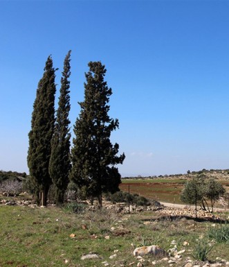 נשוב לשביל ונמשיך באיגוף שמאלי בשביל מפולס, שנראה כדרך כפרית ישנה. מעתה נצעד בבתה פתוחה, ללא עצים כמעט. מקץ כקילומטר נבחין בשלושה ברושים ובבוסתן נחמד לידם. השביל פונה לפניהם שמאלה ויורד דרומה במדרון תלול, חסר שביל ברור אך מסומן היטב. בדרך עוברים עץ חרוב קטן ומוכה רוח. כאשר השביל כמעט מגיע לערוץ שבתחתית המדרון, אנו פוגשים שביל מסומן אדום. כאן המסלול שובר את כיוונו ופונה במתינות לכיוון צפון-מזרח למרגלות מצוק נמוך. מולנו נראה מצוק גבוה ויפה, המציין את גג תצורת מֵרוז, הבנויה גיר מצורר וקירטון לחלופין. למרגלותיו פוערות מערות את פיהן במקום המכונה ח'ירבת בִּיזְרָה.
