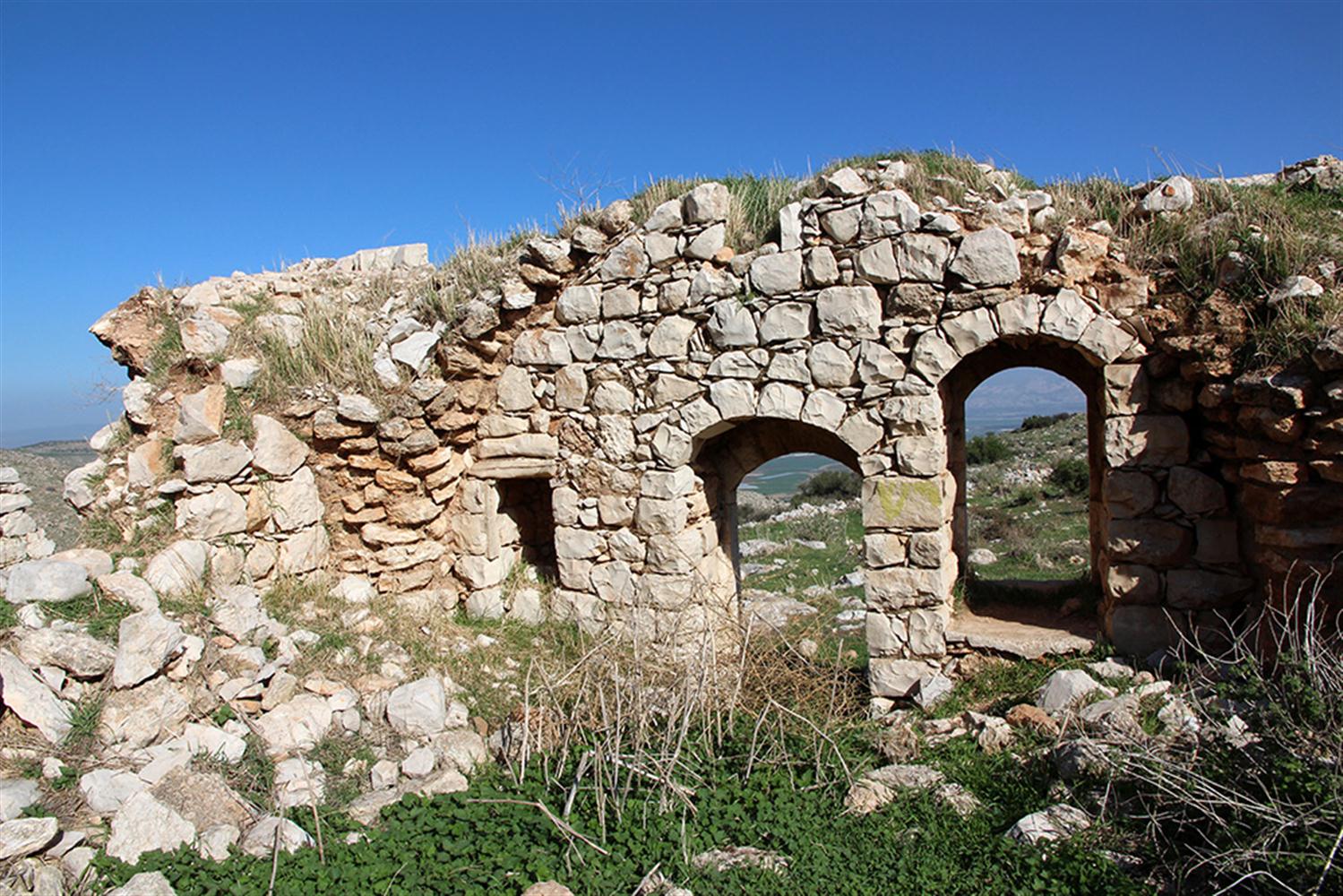 השביל המסומן אדום מתעקל ומטפס מעל למצוק. במפת סימון שבילים מצוין כאן סלע כלשהו בשם "סלע הפיל". נודה על האמת, לא הצלחנו לזהות כאן משהו שמזכיר את החיה הזאת, אך אנו כבר די עייפים וזה לא הזמן להתווכח עם מפות. לאחר צעידה של כ-1.5 ק"מ נגיע לדרך עפר, ששימשה בעבר כדרך הפטרולים. מעבר לה נראים שרידי בית ובו קיר בעל חלונות קשתיים, שהעניקו לו את השם "בית הקשתות". אחרי הליכה לא ממושכת נגיע למפגש דרך עפר – דרך הפטרולים הישנה. כאן, בצומת שבילים שחור-כחול-אדום, נמצא מבנה אבן ציורי המכונה "בית הקשתות". נראה כי בית זה שייך באופן כלשהו לאחד מבני הכפר ח'ירבת אום סרחאן, שבשרידיו נפגוש בחורבת נר, אולי משום שעסק בעניינים שהשתיקה יפה להם.