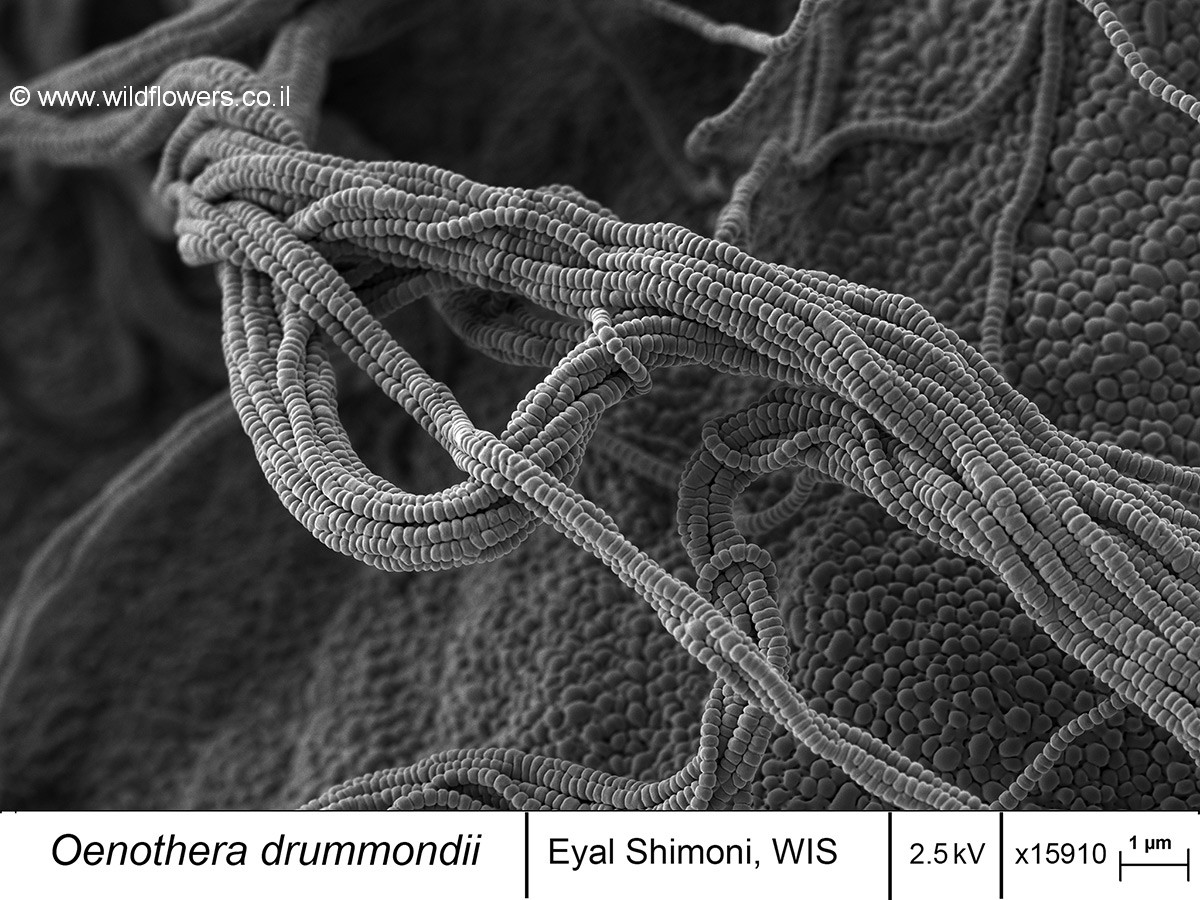 הפתעה מיוחדת במינה התגלתה לנו בהסתכלות על גרגרי האבקה של נר-לילה חופי. כל מי שהתבונן בפרח פתוח של נר-לילה ראה שהגרגרים קשורים זה לזה בחוטים דביקים, שכנראה מצמידים אותם לגוף המאביק המבקר בפרח. במיקרוסקופ האלקטרונים נראים קורים אלה כמחרוזות עבות של חרוזים עדינים.